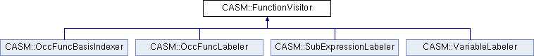 Inheritance diagram for CASM::FunctionVisitor:Defines visitor pattern for abstract Function objects. FunctionVisitor has virtual methods for each type of derived Function object, which by default do nothing. Classes that derive from FunctionVisitor implement specific visitation behavior by overloading the virtual visit() methods, as needed. An abstract FunctionVisitor object operates on a Function tree by being passed to the Function::accept(FunctionVisitor*) method of the root of the tree.